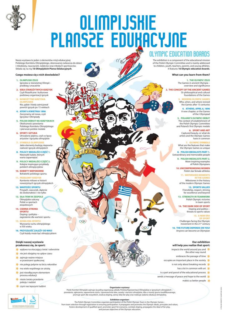 - OLIMPIJSKIE PLANSZE EDUKACYJNE – mogą stanowić całościową wystawę, która świetnie sprawdzi się na szkolnym korytarzu lub hali sportowej. W roku 100-lecia polskiego debiutu na igrzyskach olimpijskich (1924-2024), kolekcja 16 plansz powiększyła się o 2 kolejne